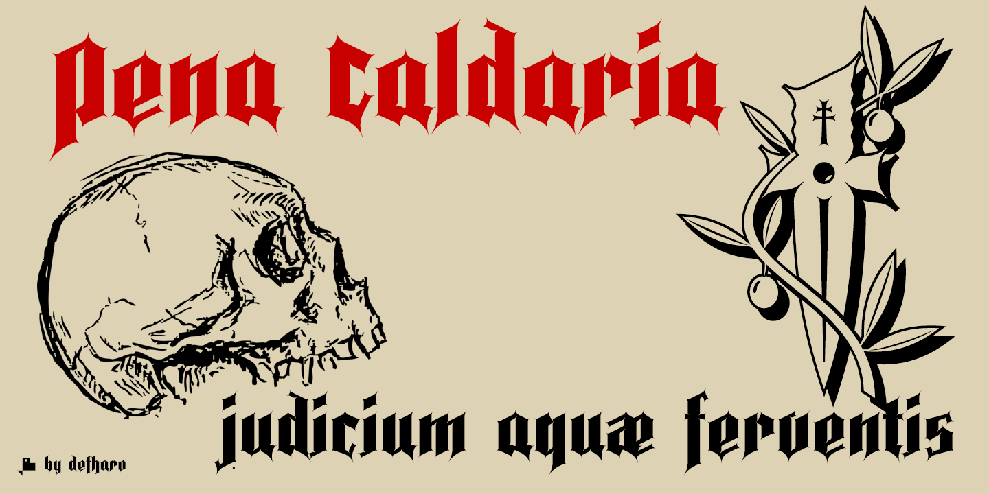 Description Pena Calvaria is a decorative and condensed Gothic typeface of intermediate style between the Blackletter and the Fraktur style, it is a very expressive typeface due to the pen finials and the carefully made interior curves that give a contemporary look to a style of fonts that five centuries after his birth they are still topical.