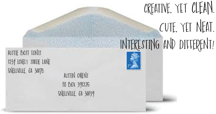 Trademark Austie Bost Envelopes Print is a trademark of Austie Bost Fonts.