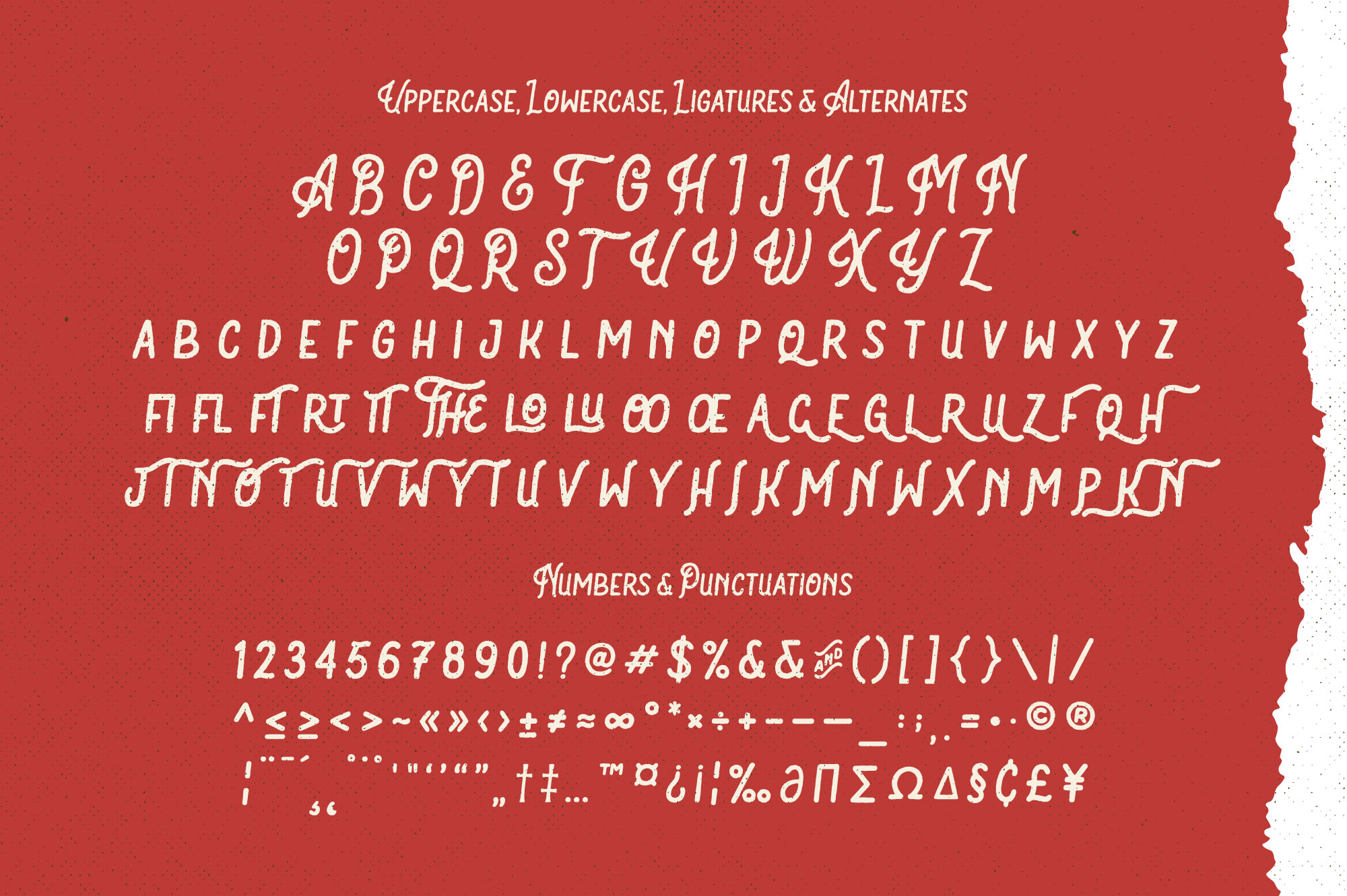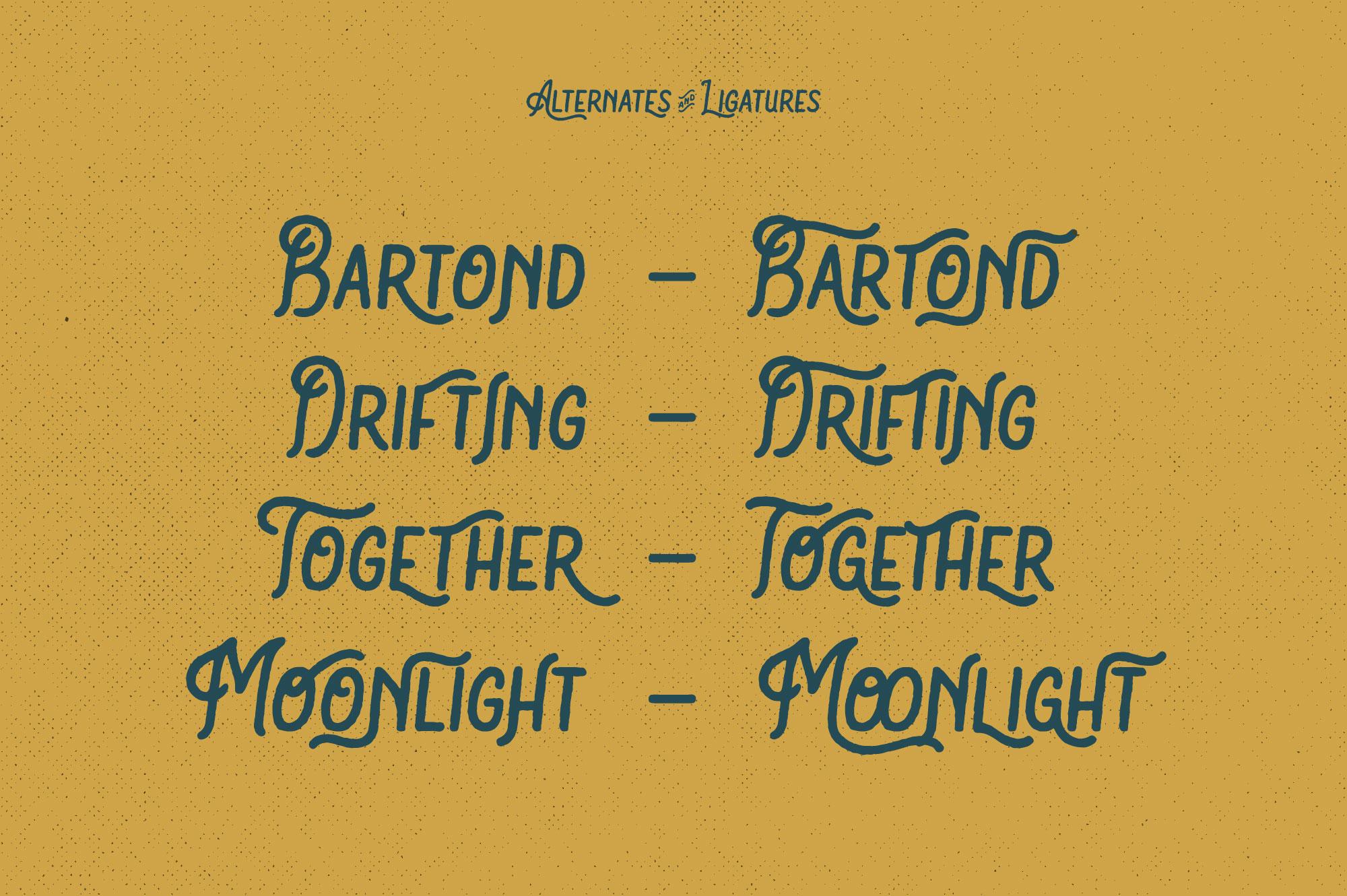 Description Bartond typeface font is inspired by vintage designs with rough lines. Make the classic impression of this font stand out more. This font has approximately 219 glyph characters including uppercase, lowercase, discretionary ligatures and standard ligatures alternatives. It is suitable for creating vintage designs such as posters, merchandise, clothing, brochures, business cards and others.