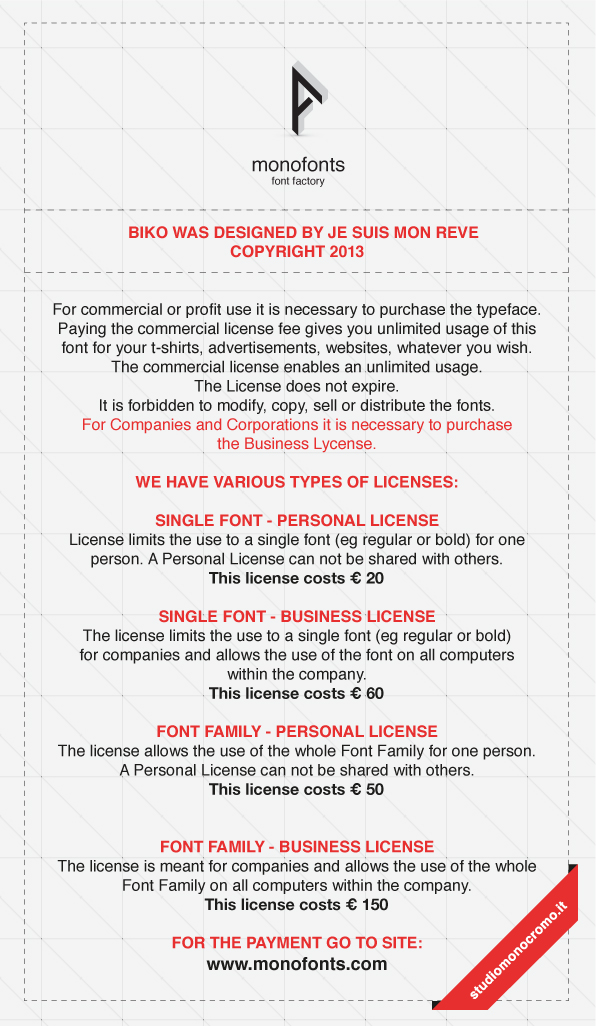 License Free for personal use. For commercial or profit use it is necessary to purchase the typeface on www.jesuismonreve.org. It is forbidden to modify, copy, sell or distribute the fonts. The Lycense allows unlimited use and it does not expire. For Companies and Corporations it is necessary to purchase the Business Lycense.