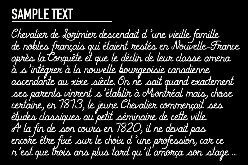 Description CF Chevalier de Lorimier Regular is a font by Cloutierfontes, designed by Steve Cloutier in 2015.