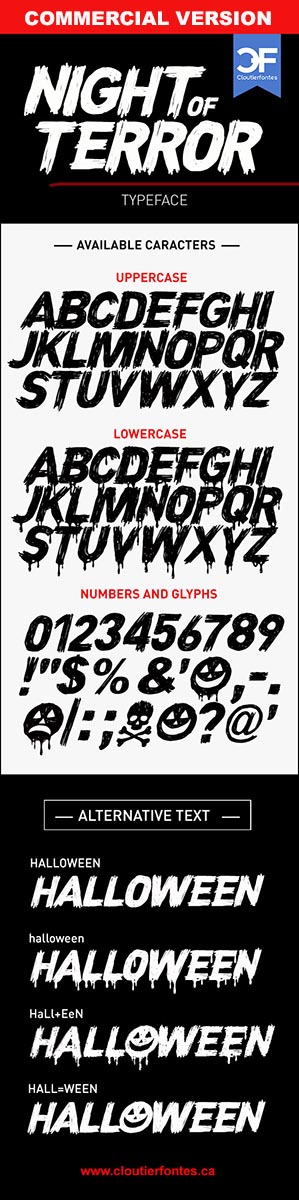 Description CF Night of Terror PERSONAL Regular is a font by Cloutierfontes, designed by Steve Cloutier in 2019.
