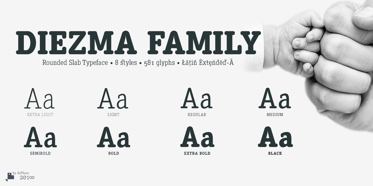 Description Diezma is a typeface with rounded Slab serifs that give it a modern and elegant look in the lighter versions, the thicker versions complement the thin ones for titles and headlines. The personality provided by the counterforms of the font and the height of the x, both generous, and the soft curves, arising from a geometric matrix give this typography its contemporary appearance.