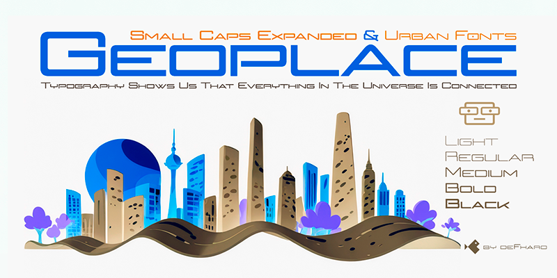 Description-en-US Geoplace Small Caps: An expanded proportion sans serif typeface family, imbued with futuristic urban style and technological inspiration, reflecting my passion for design and geometric precision to achieve unique aesthetics and exceptional legibility.