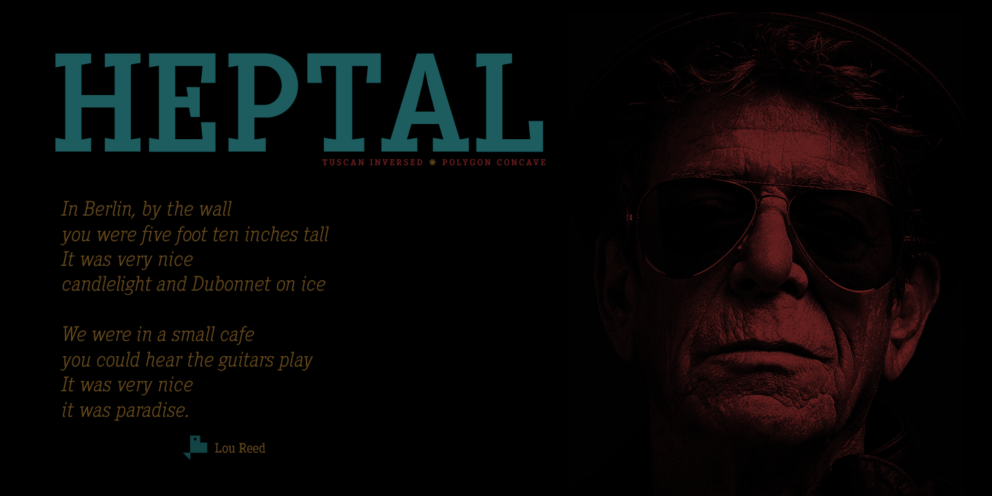 Description Heptal is a typeface family with five weights including italics true. The geometry of the characters is neo-gothic and the serifs are polygonal concave or inverted Tuscan. These fonts have a wide table of characters with support for all the languages derived from Latin. Heptal fonts offer a complete set of lowercase alternatives and advanced open type functions. The proportions, the metrics and the Kerning are meticulously configured so that the texts are shown fluid and the graphic stain is compensated.