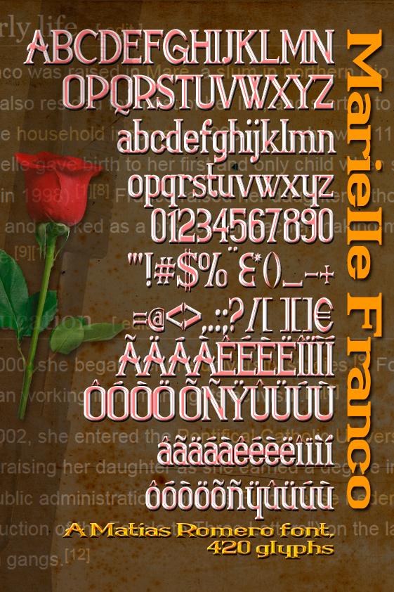 1. Don't upload it elsewhere claiming it is yours. Should you want to place it in a collection outside DA, dafont.com or fontspace.com, authorization is required and can be obtained at my user page, http://matiasromero.deviantart.com/ or sending me a request to matiasromero@gmail.com. Permission is most likely to be given, but it has to be asked for. Needless to say, a link back to http://matiasromero.deviantart.com/ is appreciated (yet not required) even with such authorization.