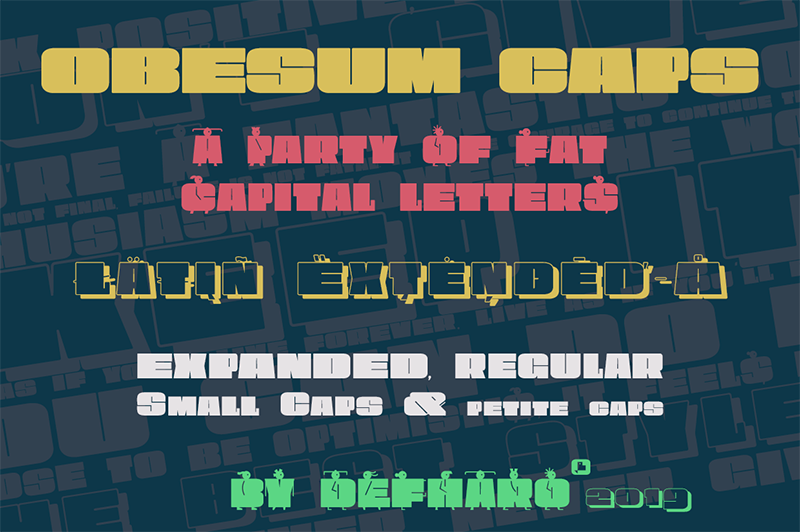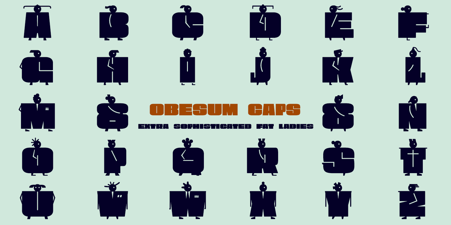 Description Obesum Caps is a very thick geometric typeface with great contrast in the counterforms, it is made in homage to the capital letters and obese girls. The font has five sets of uppercase letters: Capital letters are extended, lower case letters are more squares, and there is a version in small caps of a semi-expanded proportion, all of them with idiomatic support for Latin Extended-A, in addition to the standard alphabet and numbers in small size for the positions: Inferior, Denominator, Numerator and Superior, the letters and numbers have support for dynamic fractions and ordinals, besides the numbers have 3 different set: The normal numbering extended with the height of the capitals, old numbers to use with the small caps version of the letters and that have the height of the x and finally a third version of numbers for annotations.