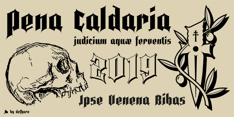 Description Pena Calvaria is a decorative and condensed Gothic typeface of intermediate style between the Blackletter and the Fraktur style, it is a very expressive typeface due to the pen finials and the carefully made interior curves that give a contemporary look to a style of fonts that five centuries after his birth they are still topical.