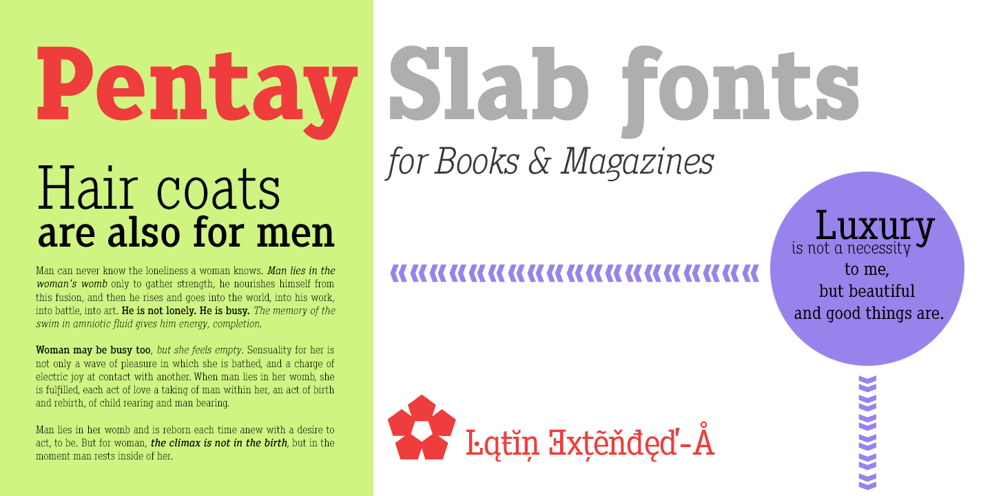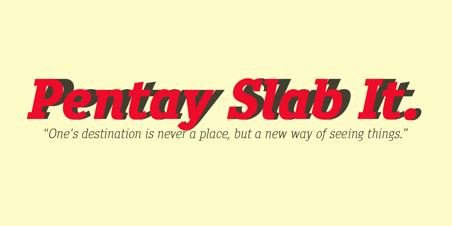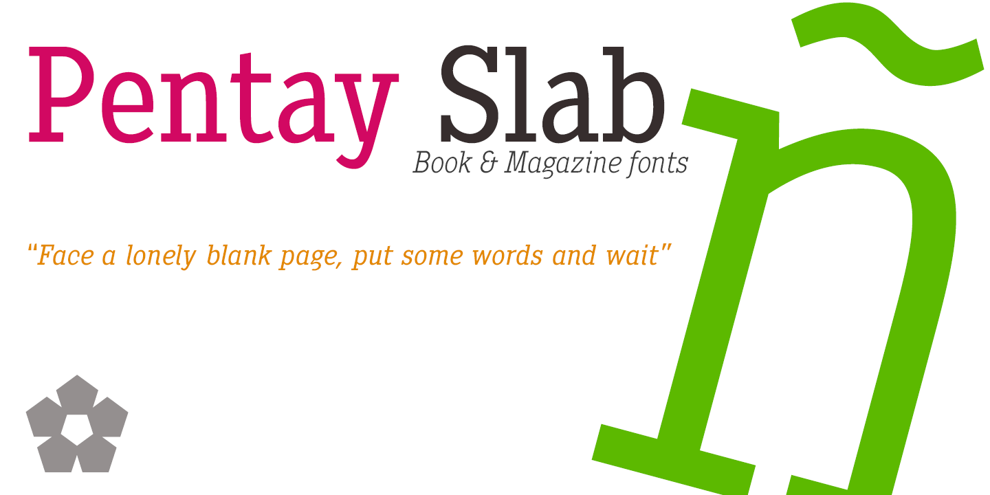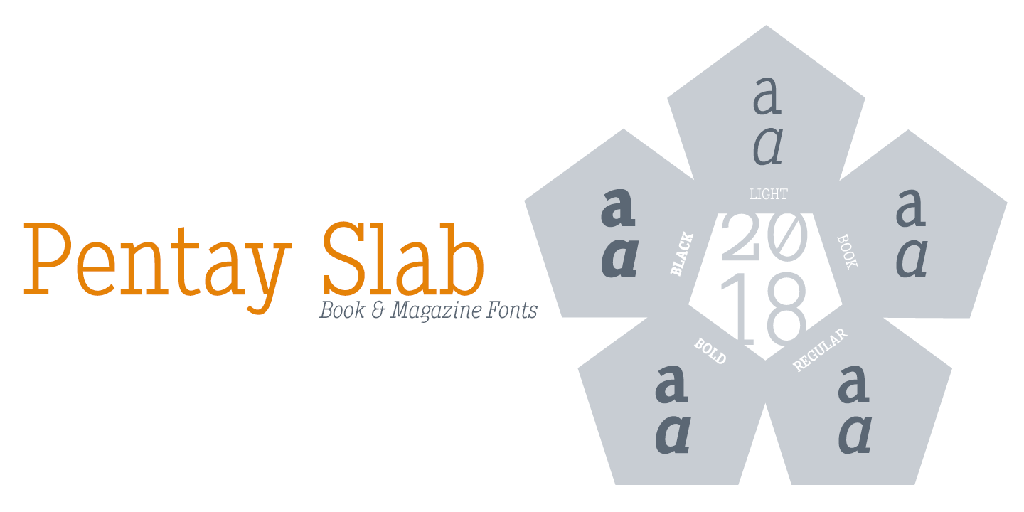 Description Pentay is a Slab Serif typeface family with 10 styles designed especially for editorial design and publications in general. The proportions of the font as well as the metrics and the kerning have been carefully calculated to obtain maximum readability. The fonts also have a complete set of lowercase alternatives and advanced OpenType features