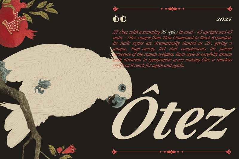 Description-en-US Otez is a refined serif typeface family inspired by classical elegance and expressive form. Designed with a high editorial contrast and wide stylistic range, Ôtez features 90 styles across five subfamilies — from Thin Condensed to Black Expanded. Its graceful details and strong posture make it a timeless companion for identity, publishing, and display.